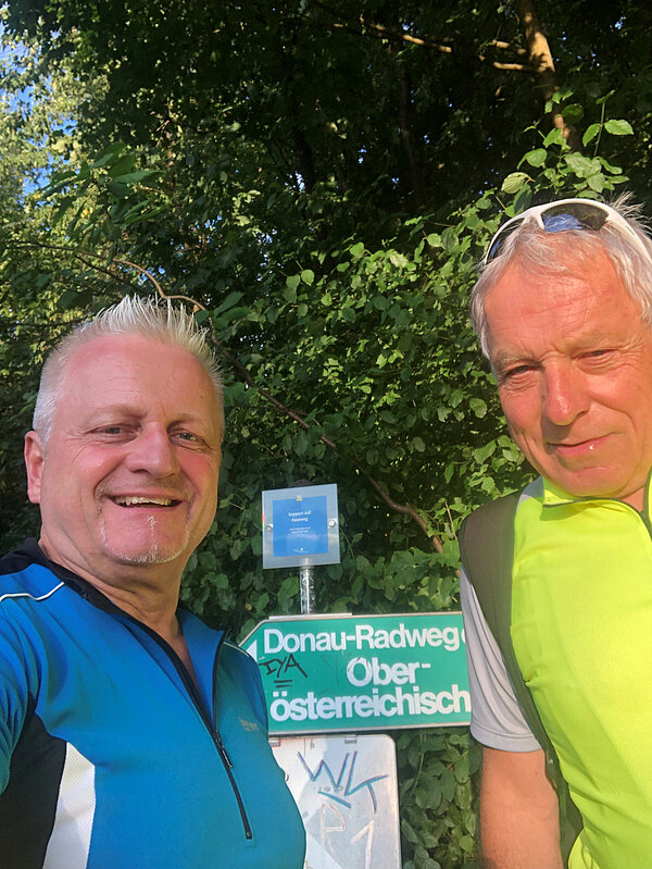 Ein wesentlicher Meilenstein auf diesem Weg war die erste offizielle Beschilderung des Donauradwegs. Auf dem Bild sieht man die beiden Gründer der Firma: Jörg Preimesberger (links) und Manfred Traunmüller (rechts), die gemeinsam die Vision der Donau Touristik ins Leben riefen. Durch die Beschilderung, die von uns initiiert wurde, konnten wir eine völlig neue Art des Radfahrens entlang der Donau möglich machen, und so den Weg für den florierenden Radtourismus in der Region ebnen.