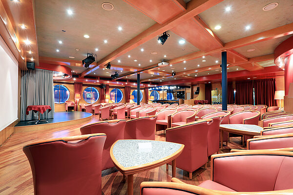 Das Bordtheater „Primo Teatro" bietet Platz für 160 Gäste. Außer bei Radkreuzfahrten finden im einzigen Bordtheater ALLER Donau-Schiffe an bis zu 6 Abenden/Woche Veranstaltungen statt. Künstler aus der jeweiligen Region treten auf (= keine Bordanimation, die jeden Abend gleich ist). Dies können ein A-cappella-Chor aus der Slowakei, eine original-Zigeunerband mit 4 oder 5 Musikern mit echtem Primas, ein Humorist mit „Sachen zum Lachen“ oder auch Folklore-Gruppen (zum Beispiel aus Novi Sad mit 28 Personen) sein. In der täglichen Bordzeitung „MS-Primadonna-heute“ werden Sie genau informiert. Tagesaktuelle Zeitungen wie Süddeutsche, De Telegraaf, Kronen Zeitung bzw. Standard stehen gratis zur Verfügung.