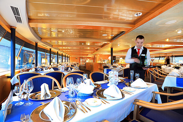 Gastro-Chef Pietro de Rosa und sein Team kreieren an Bord erstklassige Speisen, von Wiener Küche bis zu saisonalen Gerichten aus den Donauländern. Auf dem Menü stehen ein reichhaltiges Frühstücksbuffet, servierte 3- oder 4-Gang-Menüs zu Mittag und Abend, Nachmittagskaffee mit Kuchen sowie ein Mitternachtssnack. Vegane, vegetarische und laktosefreie Optionen sind auf Anfrage erhältlich.